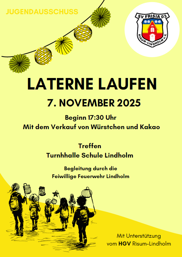 Am Freitag, den 7. November 2025, findet das traditionelle Laternelaufen in Lindholm statt. Treffpunkt ist um 17:30 Uhr an der Turnhalle der Schule Lindholm. Für das leibliche Wohl ist mit Würstchen und Kakao gesorgt. Die Begleitung übernimmt die Freiwillige Feuerwehr Lindholm.