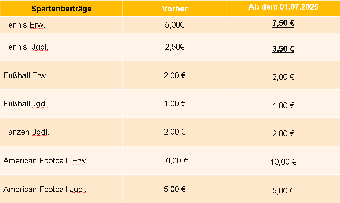 Zudem sind seit der letzten Beitragsanpassung im Jahr 2014 die Kosten für den Betrieb unserer Sportanlagen kontinuierlich gestiegen – etwa durch höhere Energiepreise, Instandhaltungskosten und allgemeine Preissteigerungen.